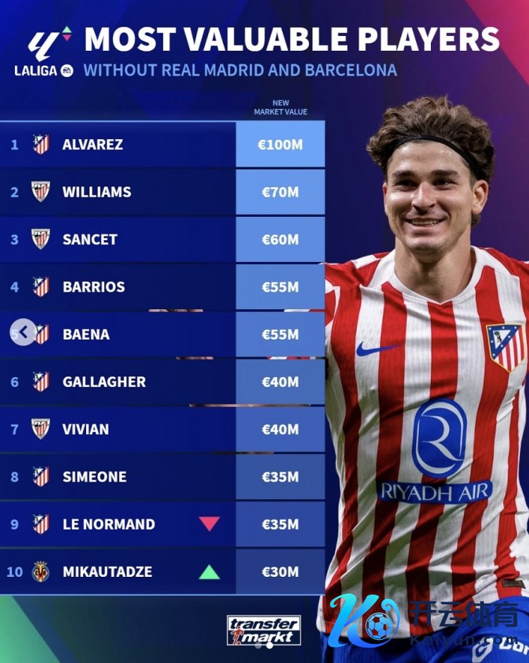 10月3日讯 西甲球员身价更新,德转列出西甲非皇马和巴萨球员的身价前十,阿尔瓦雷斯1亿欧第一。