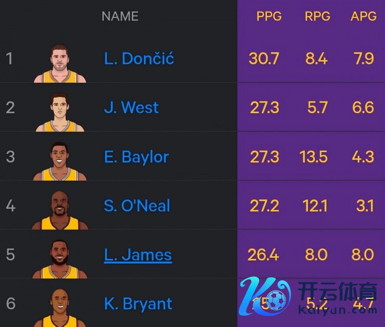 2026-01-13包括季后赛 1、东契奇 场均30.7分 2、杰里·韦斯特 27.3分 2、贝勒 27.3分 4、奥尼尔 27.2分 5、詹姆斯 26.4分 6、科比 25.1分体育集锦