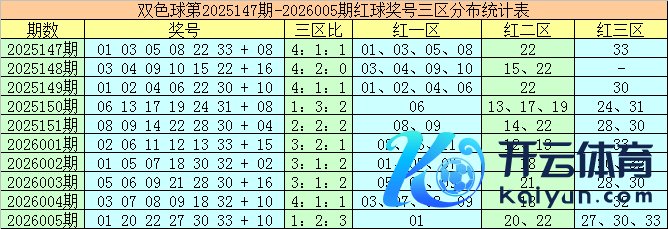 双色球第2026005期开出奖号为:01、20、22、27、30、33+10体育集锦,其中红球三区比为1:2:3,蓝球开出偶数、大号、1路号码。