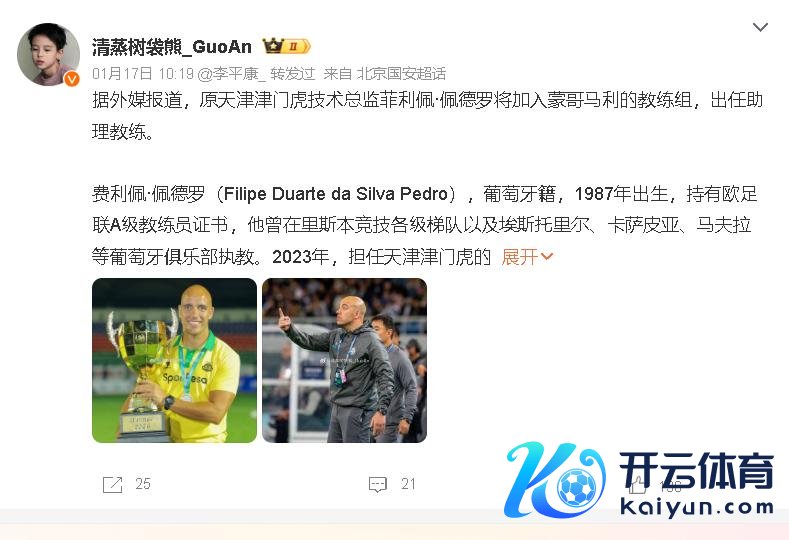 黄强歪谈体育以为,当各人齐在质疑北京国安弗成,广宽球员离开,就连总司理齐走了,这支球队若何发展?当官宣蒙哥马利执教,又官宣4位妖星加盟,让球队合座实力进步几个层次,如今又邀请具有葡萄牙青训教父之称的佩德罗,他的加入,更是让球队如虎添翼,蒙哥马利擅长首要体系,佩德罗擅长珍惜组织,两东谈主可酿成攻守均衡,他还领有培养年青球员的上风。