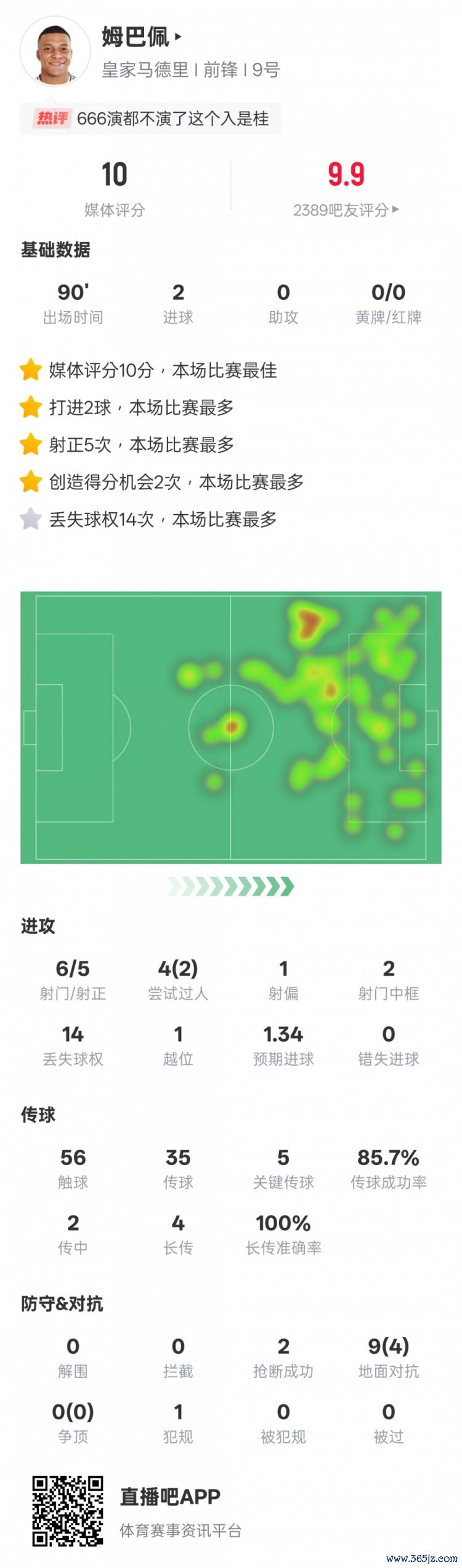 1月20日讯 西甲第20轮,皇马主场4-1拉斯帕尔马斯。本场比赛姆巴佩首发出战,孝敬2粒进球,送出5次关节传球,尽管有14次丢失球权是全场最多,但仍获评全场最高的10分。