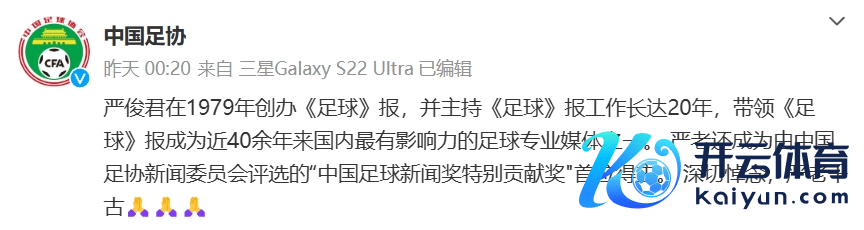 “严俊君在1979年创办《足球》报,并主捏《足球》报责任长达20年,指导《足球》报成为近40余年来国内最有影响力的足球专科媒体之一。严老还成为由中国足协新闻委员会评比的“中国足球新闻奖尽头孝敬奖“首位得主。潜入吊祭,严老千古!”