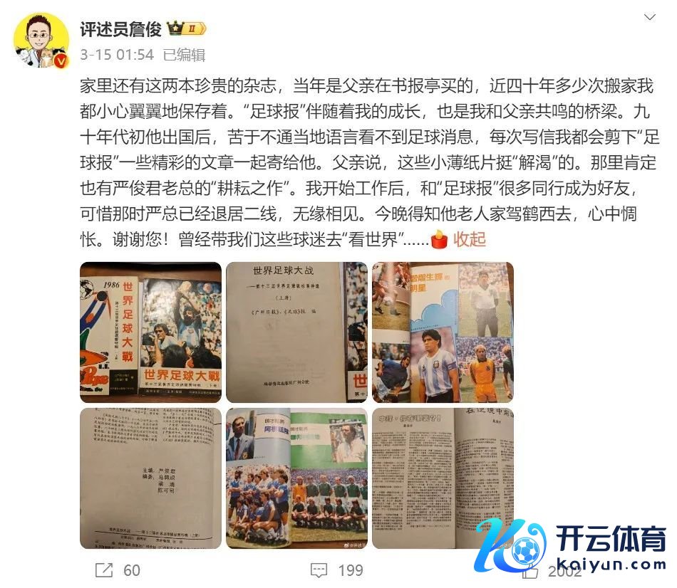 “《足球》报创始东说念主严俊君老总2025年3月14日仙逝,享年86岁。当作该报最早的特约记者之一,在中国作事足球和足球媒体‘起步即巅峰’的那段好意思好时光,我跟严老有过数年报东说念主与作家之间的密切错乱,对这位‘中国足球媒体教父’出打算策的新闻策动功力有着亲自的体会和忠诚的钦佩。《足球》报粗略以数百万份的刊行量和重大的影响力成为其时国内公认的第一足球媒体,严老当记头功。”