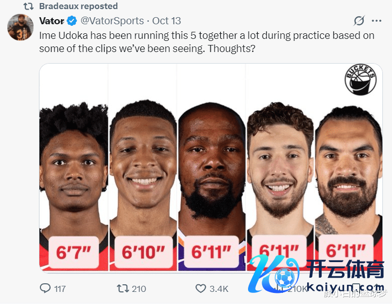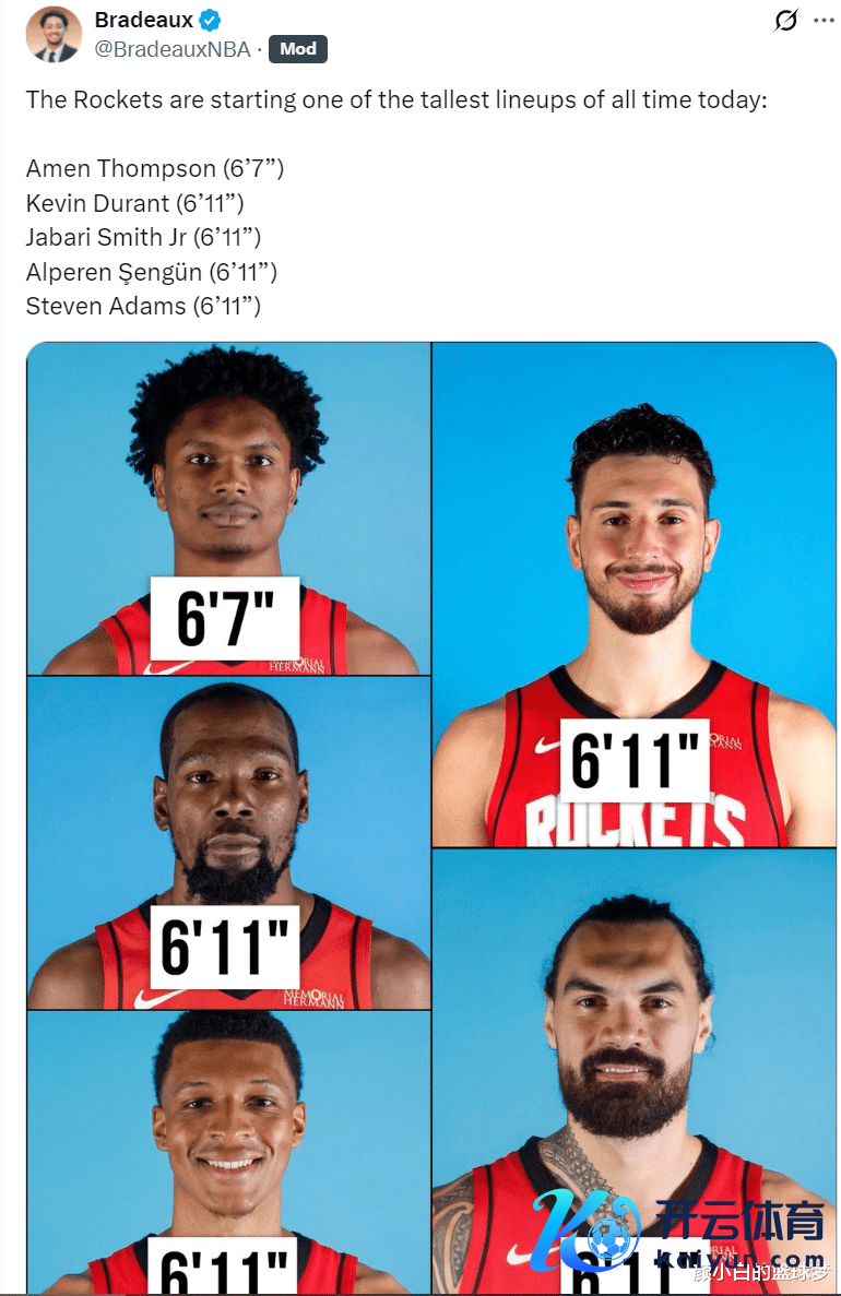 这套先发声势阿门6尺7(2.01米)、小贾巴里6尺10(2.08米)、杜兰特6尺11(2.11米)、申京6尺11(2.11米)、亚当斯6尺11(2.11米),先发平均身高2.084米。