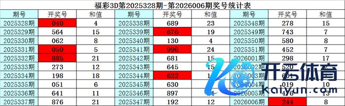 上期总结:福彩3D第2026006期奖号为:244,其中奖号组选类型为:组三,奇偶比为0:3,大小比为0:3,012路比为0:2:1,和值为10,跨度为2。