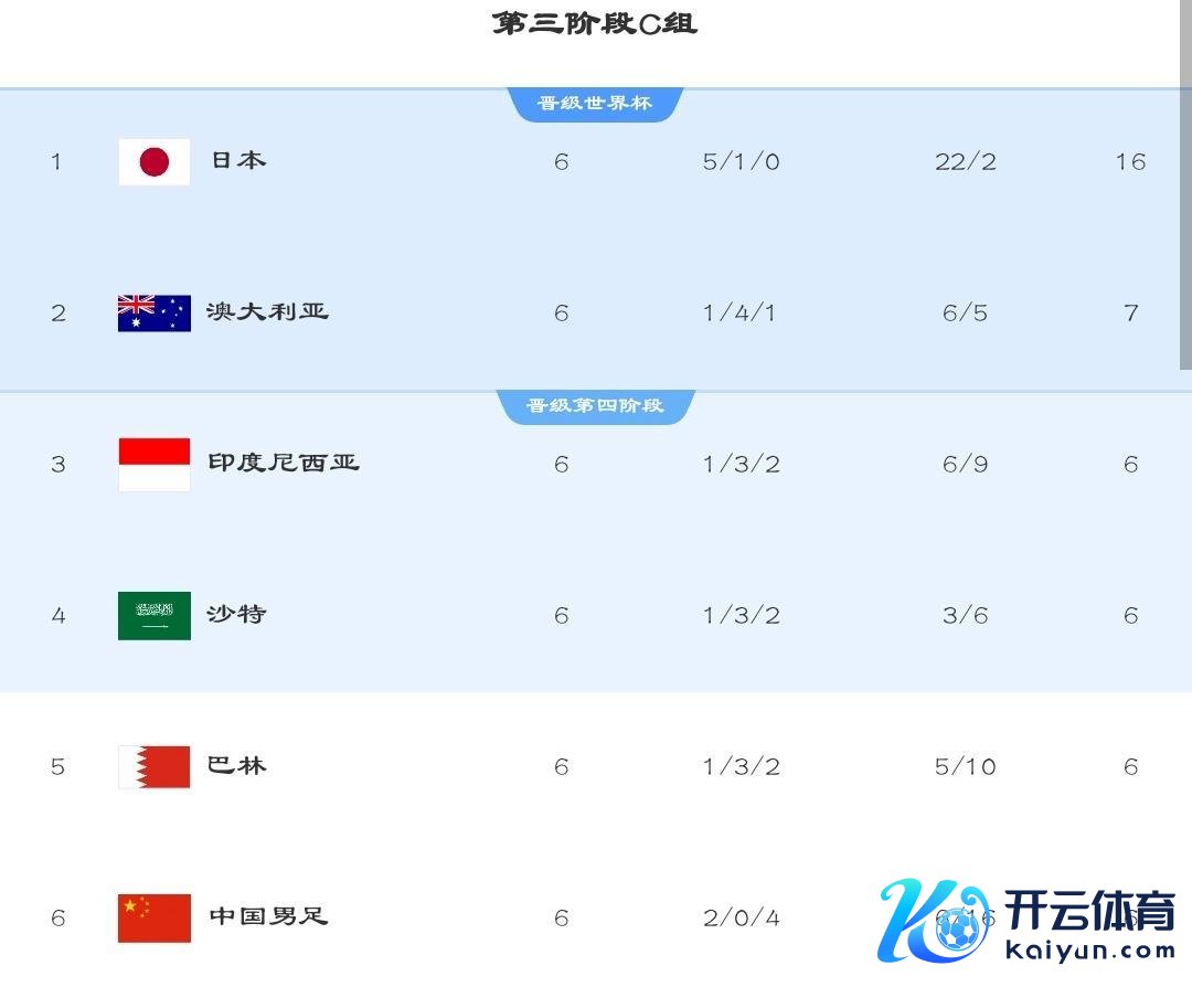6轮事后,C组的最新积分榜情况,日本队积16分高居小组第一,澳大利亚积7分排行小组第二,印尼,沙特,巴林以及中国男足四队的积分都是6分,以净胜球几许排行,印尼排行第三,沙特排行第四,巴林排行第5,中国男足排行第6,天然国足排行小组垫底,但只逾期第二名澳大利亚1争,一切都有可能。