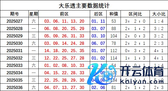 上期回归:大乐透上期奖号为:前区04 07 13 27 30,后区02 06,前区奖号和值为81,区间比2:1:2,大小比为2:3体育录像/图片,
