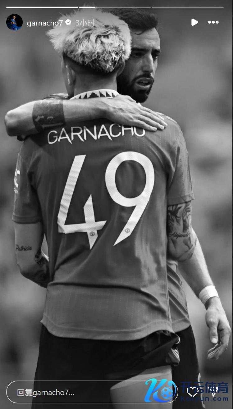 加纳乔社媒晒出我方与前队友B费的赛花式照,其时他身穿曼联49号球衣。