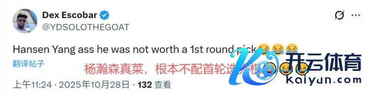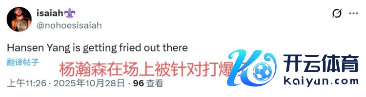 2025-12-24体育赛事直播 10月27日讯 NBA旧例赛,开荒者客场107-114不敌快船。 本场比赛,杨瀚森再次是仅在比赛首节取得出战契机,他替补登场4分20秒,三分1中0,罚球2中2,得到2分1篮板(迫切篮板)1犯规,正负值-2。 媒体东谈主@只对于篮球发文谈到了杨瀚森,试验如下: 开荒者G3:杨瀚森2分1篮板 比赛后不评了,临了纯智力不行,快船有卡巨,下半场船降节拍,开荒者小声势失效,何况三分今天也莫得。 今天就只说杨瀚森的部分,看了一些驳斥和弹幕,不知谈那些球迷是特殊也曾何如。 杨瀚森惟有第一节打四