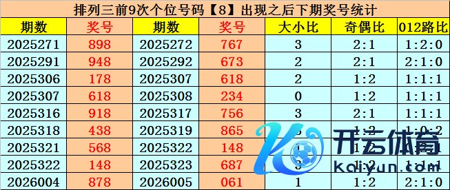 个位号码:上期奖号为大号、偶数、2路号码:8,历史上个位号码8共开出767期,前一次出咫尺第2026004期,上期遗漏1期再出。