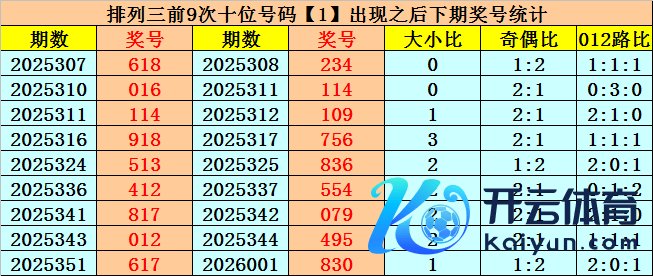 在十位前9次出现号码1后,其下期奖号差异开出:3-1-0-5-3-5-7-9-3,其中奖号个数奇偶比是8:1,大小比是4:5,012路比是5:2:2。
