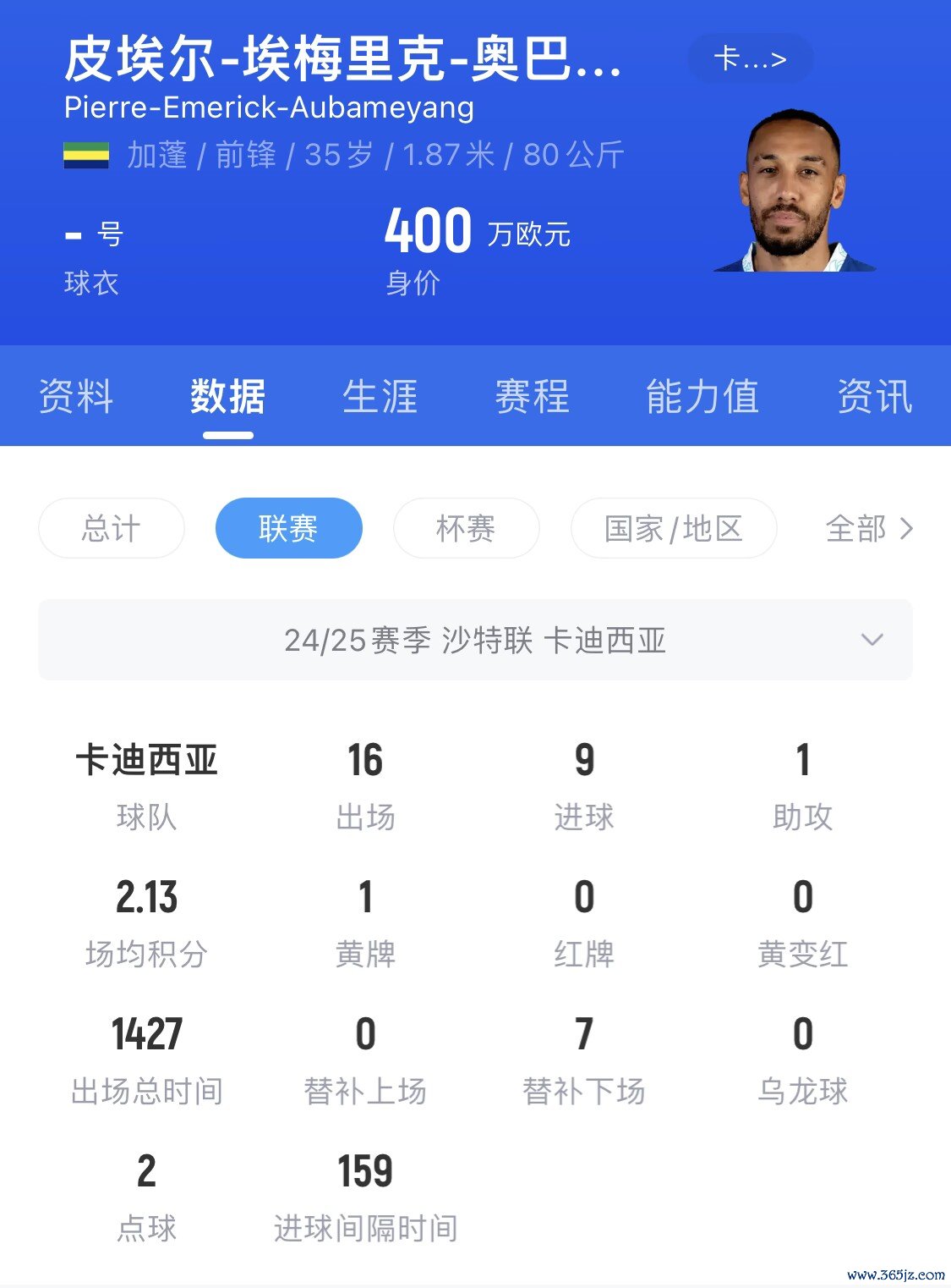 奥巴梅扬转会费900万欧,本赛季于今已在沙特联16场完成9球1助,对眉月绝杀,对得胜打入制胜球,对吉达集会破门。