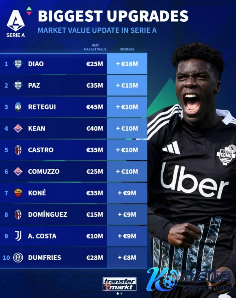 3月30日讯 德转此前更新了意甲球员身价,并清点了增值最高的10东说念主榜单,其中曼联引援量度小将迪奥居首,以下为具体榜单: