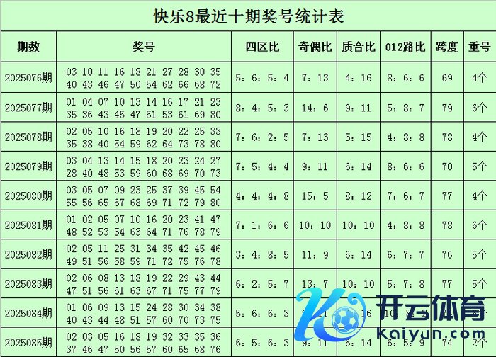 福彩大肆8第2025085期开奖归来:02 03 05 16 18 19 32 33 35 36 37 46 47 50 56 57 60 65 68 76,其中奖号四区比为6:5:6:3,奇偶比为9:11,质合比为6:14,跨度为74,012路比为6:5:9,开出2个重号:57、60。