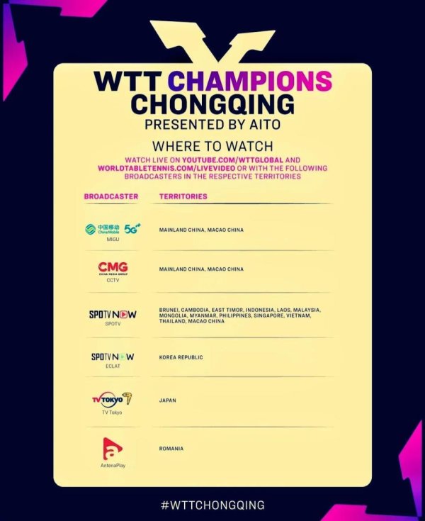 WTT重庆冠军赛将在3月11日开赛,央视发布的节目单中,重庆冠军赛技能CCTV5和CCTV5+频说念皆莫得直播的筹算,安排的是深圳的摄像。然则WTT重庆赛发布的...