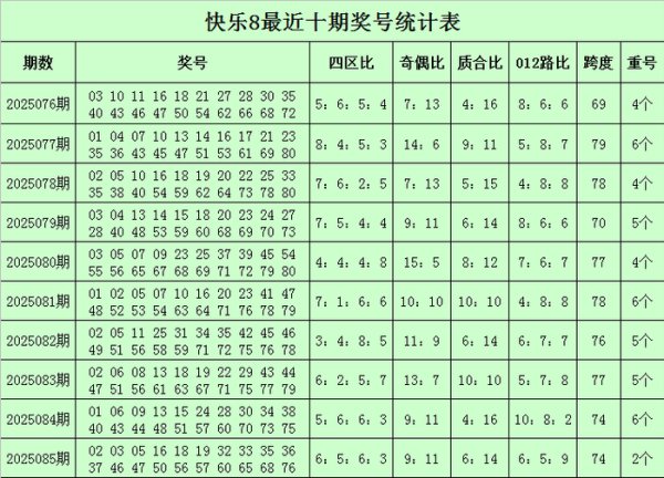 福彩大肆8第2025085期开奖归来:0203051618193233353637464750565760656876,其中奖号四区比为6:5:6:3,奇偶比为...