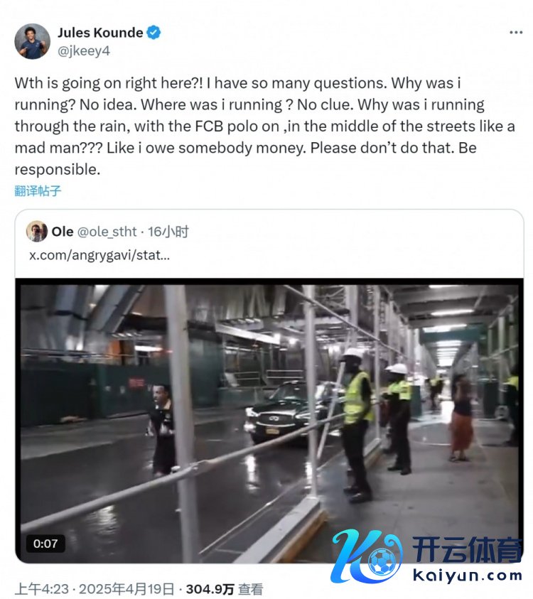 有球迷晒出伪造的视频,践诺为孔德在街头冒雨跑步,对此孔德回复说念:“这是何如回事?!我有许多疑问。为什么我要跑?全皆不知说念。我在往那处跑?毫无条理。为什么我穿戴巴萨的POLO衫,冒着雨,像个疯子相通在街说念中央跑?就像我欠了别东说念主钱似的。寄予别这么,要负包袱。”