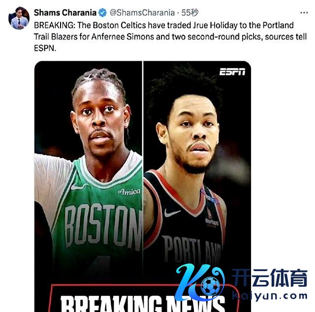 据NBA爆料大王Shams Charania的音问,凯尔特东说念主仍是把朱·霍勒迪打包送到了波特兰开发者,换回了安芬尼·西蒙斯和两个次轮选秀权。