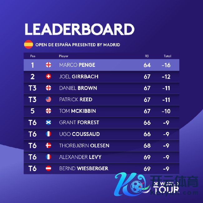瑞士32岁选手乔伊-吉尔巴赫(Joel Girrbach)在临了一个洞推入4英尺小鸟,打出67杆,跃升到单独第二位,三轮收货为201杆(69-65-67),低于法式杆12杆。
