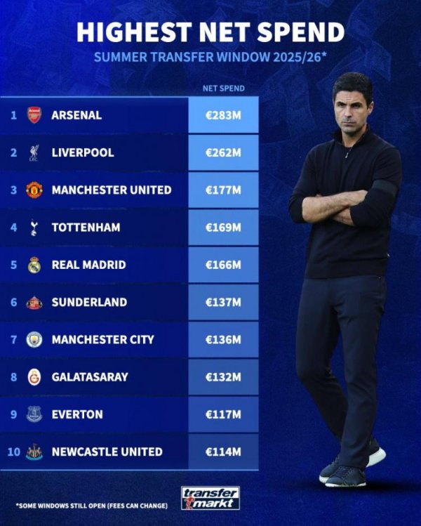 直播吧9月4日讯 德国转会商场统计了今夏各队转会净开销体育最新信息,并排出榜单,阿森纳2.83亿欧居首。 今夏俱乐部转会净开销名次: 阿森纳——2.83亿欧 利...
