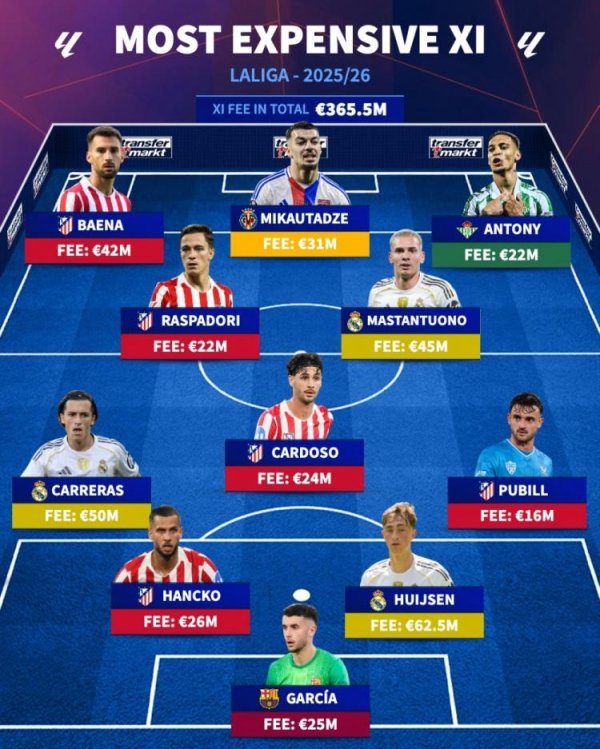 直播吧9月4日讯 德国转会市集列出了西甲今夏最贵引援声势,安东尼、马斯坦托诺、赫伊森、卡雷拉斯在列。 西甲今夏最贵引援声势(转会费) 门将:霍安-加西亚(250...