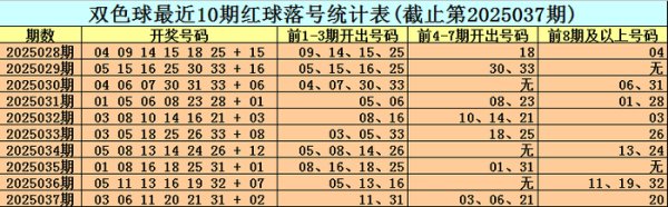 上期开奖:双色球第2025037期奖号为:030611202131+02体育最新信息,其中红球11、31包含在前1-3期的奖号中,红球03、06、21包含在前4...